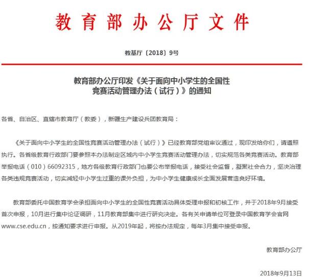 近日,教育部辦公廳印發(fā)文件表示,不得組織中小學(xué)生參加清單之外的冠以“全國(guó)”“國(guó)家”等字樣面向中小學(xué)生的競(jìng)賽。在競(jìng)賽產(chǎn)生的證書(shū)顯著位置,要標(biāo)注教育部批準(zhǔn)文號(hào)及“不作為中小學(xué)招生入學(xué)依據(jù)”等字樣。...